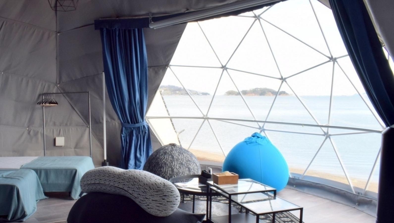 目の前に海が広がる最高のロケーションと、テント直径約7mの広々とした室内空間とで...
