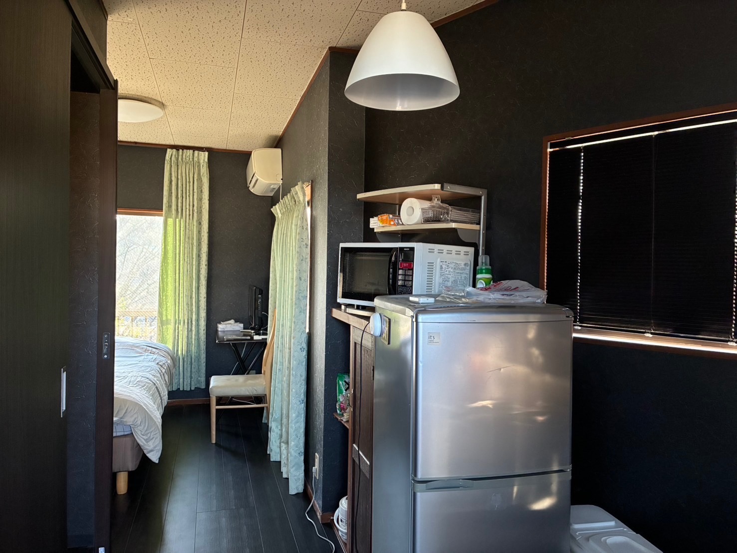 この建物には2つの宿泊施設があり、壱番館は左側の低めの入口ドアからアクセスします。建物隣接の鉄骨製に2台駐車可能です。