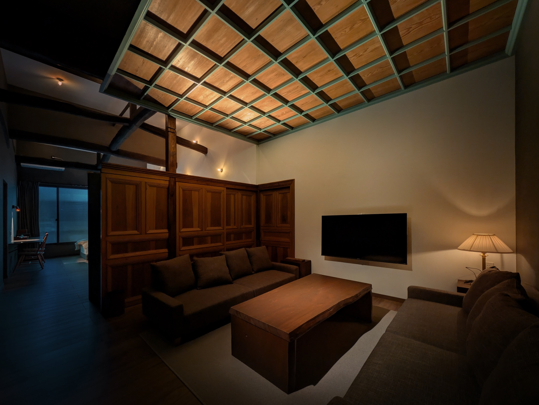当時の書斎・応接間だった天井は浮遊感を持たせて残し佐渡の星空をイメージした照明が特徴的な部屋です。