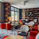 開放感あふれるリビングルーム、シックなカラーと木肌のぬくもりあるインテリ...