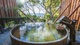 客室の天然温泉半露天風呂は桶風呂です。...
