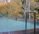 鹿教湯温泉から東へ約3キロ 霊泉寺川にかかる赤い欄干の橋を渡ると