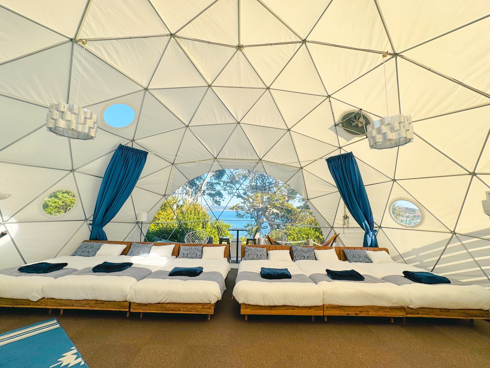 天候を気にせず楽しめるソロ、カップル、学生、学生コンパ、学生ゼミ、学生合宿、デュオ、グループ層向けリゾートグランピング施設です。海を存分に楽しめる!