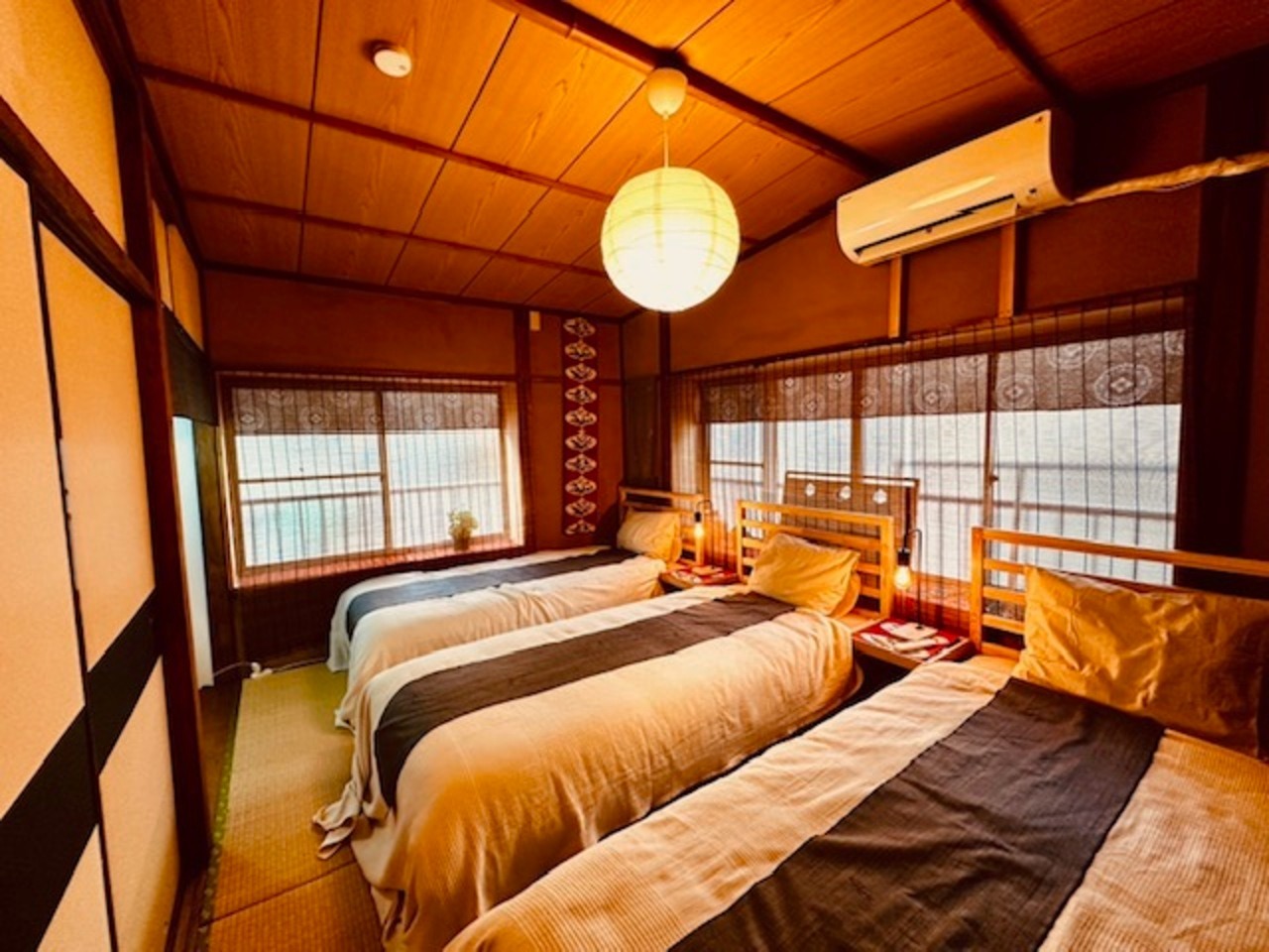 エアコン/ダブルベッド2台/テレビ/IH/冷蔵庫/電子レンジ/ケトル/鍋、フライパン/包丁、まな板、ピーラー、料理用ハサミ、フライ返し、...